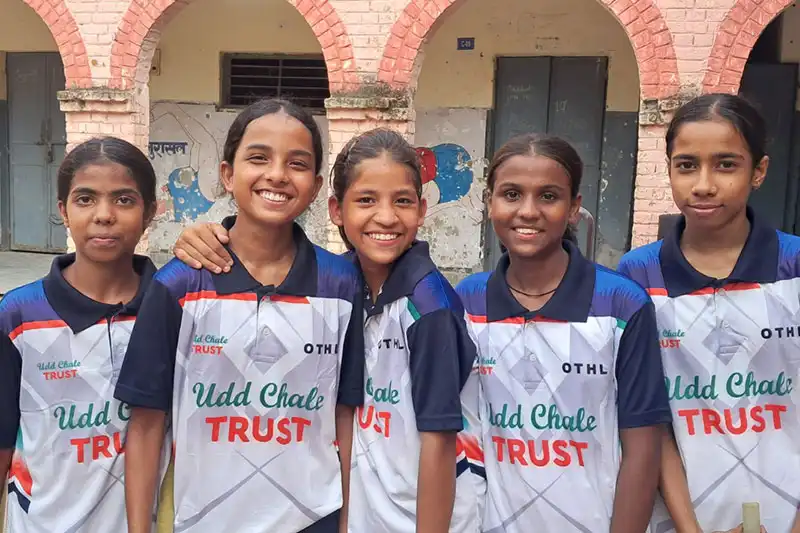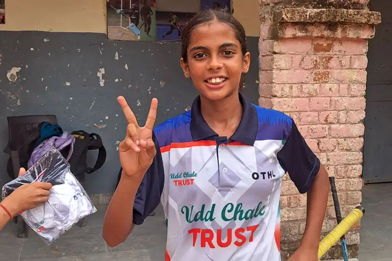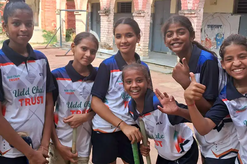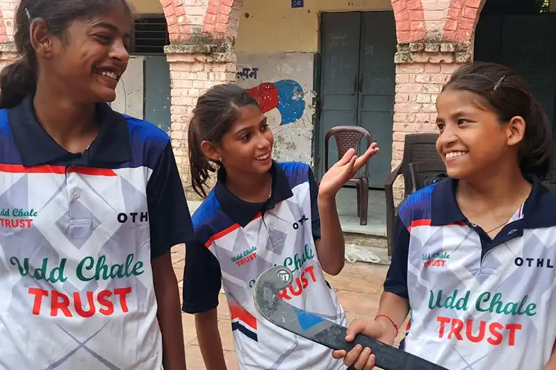 Free distribution of hockey sticks, kits, T-shirts, jerseys, shoes, and protective gear—provided by Udd Chale Trust.